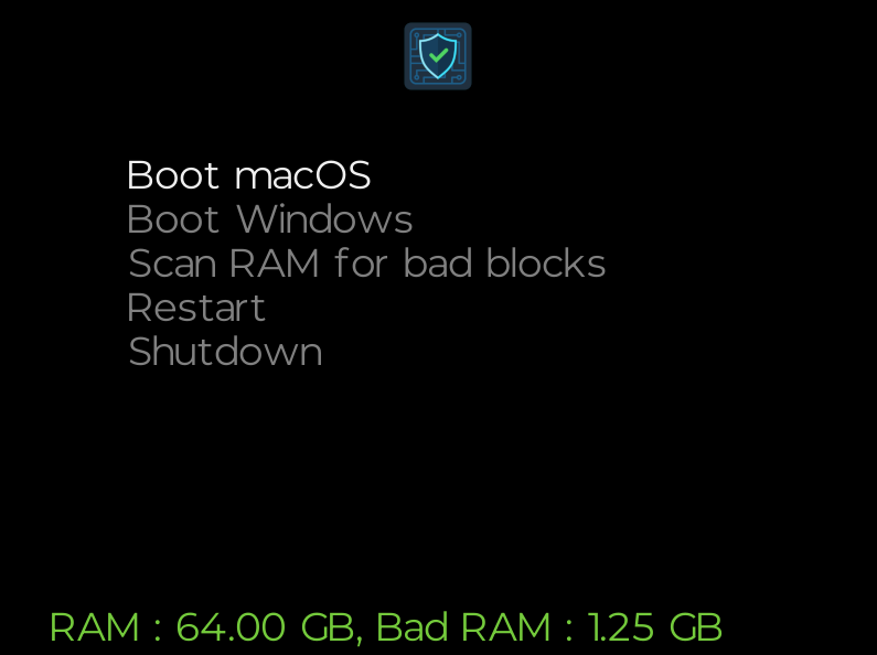 RamFixer provides a startup interface that lets users boot into macOS or Windows, run a memory scan for bad blocks, restart, or shut down the machine.
